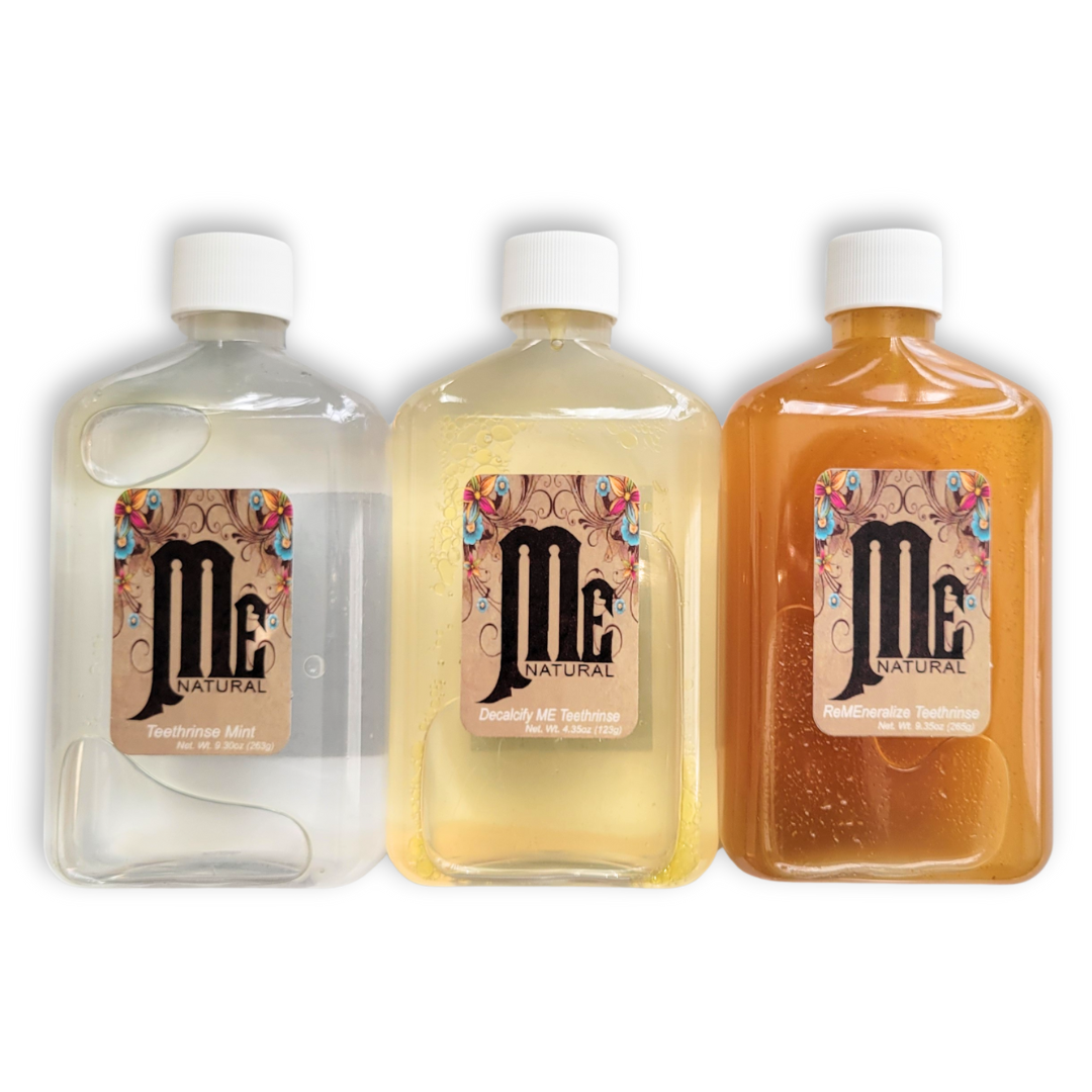 The Tr3-o includes all 9.35oz: Teethrinse Mint, Decalcify ME Lemon-Tea Tree, & ReMEneralize Cinnamon -Orange